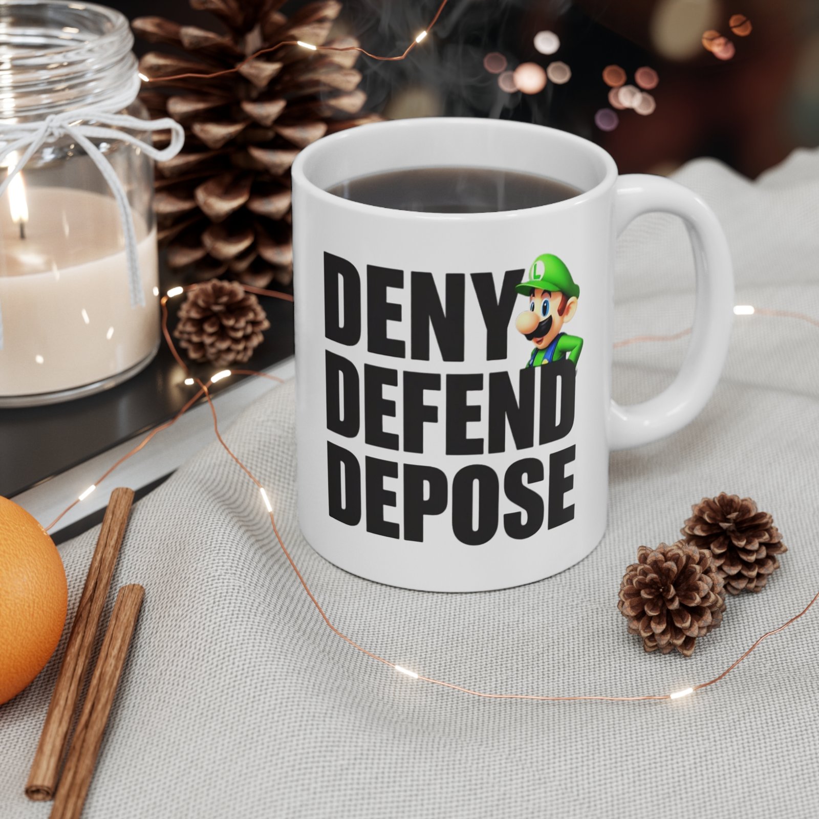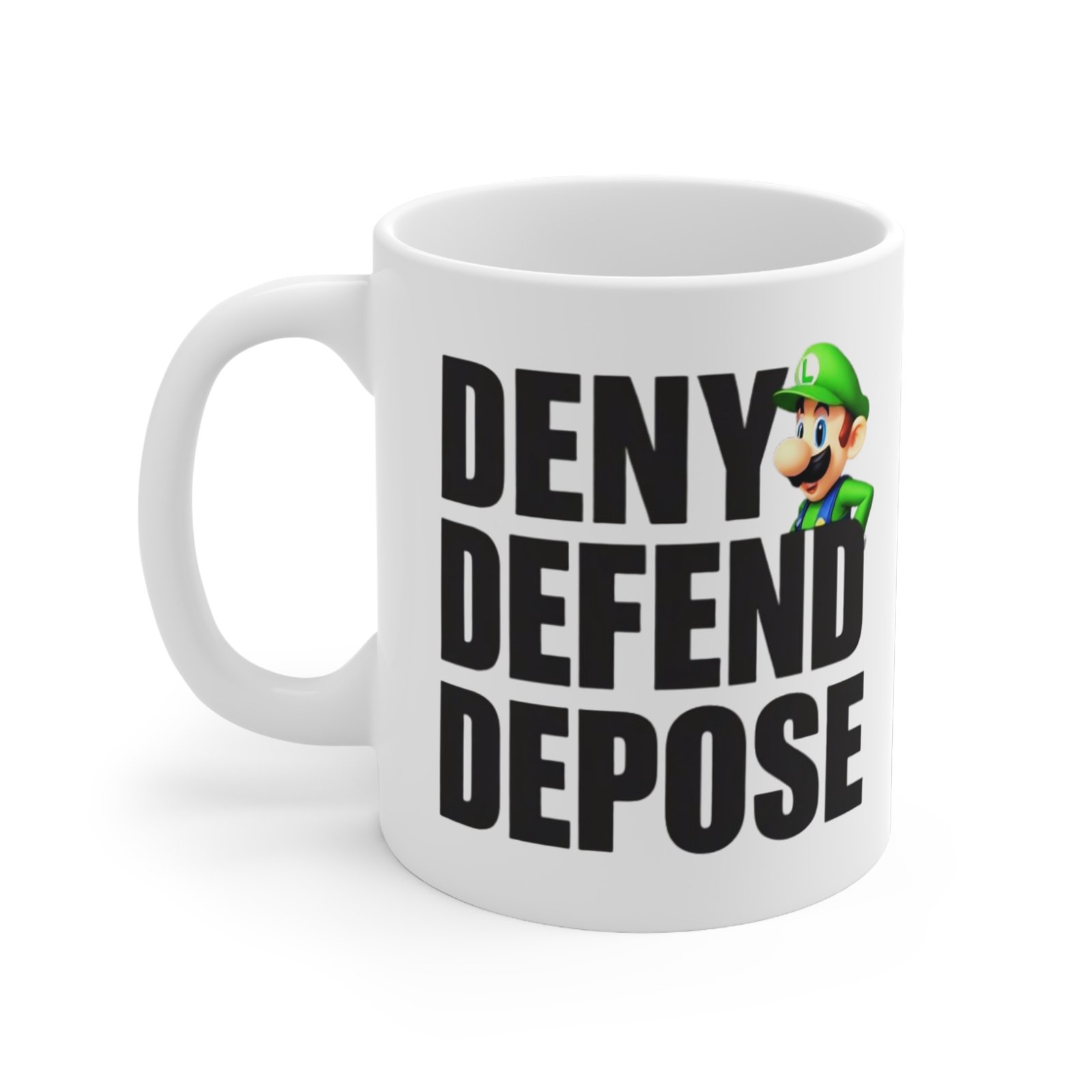 Deny, Defend, Depose white ceramic mug, perfect for anyone who wants to make a statement in the office, home or party. The mug is made of white, durable ceramic and comes in an 11oz size.